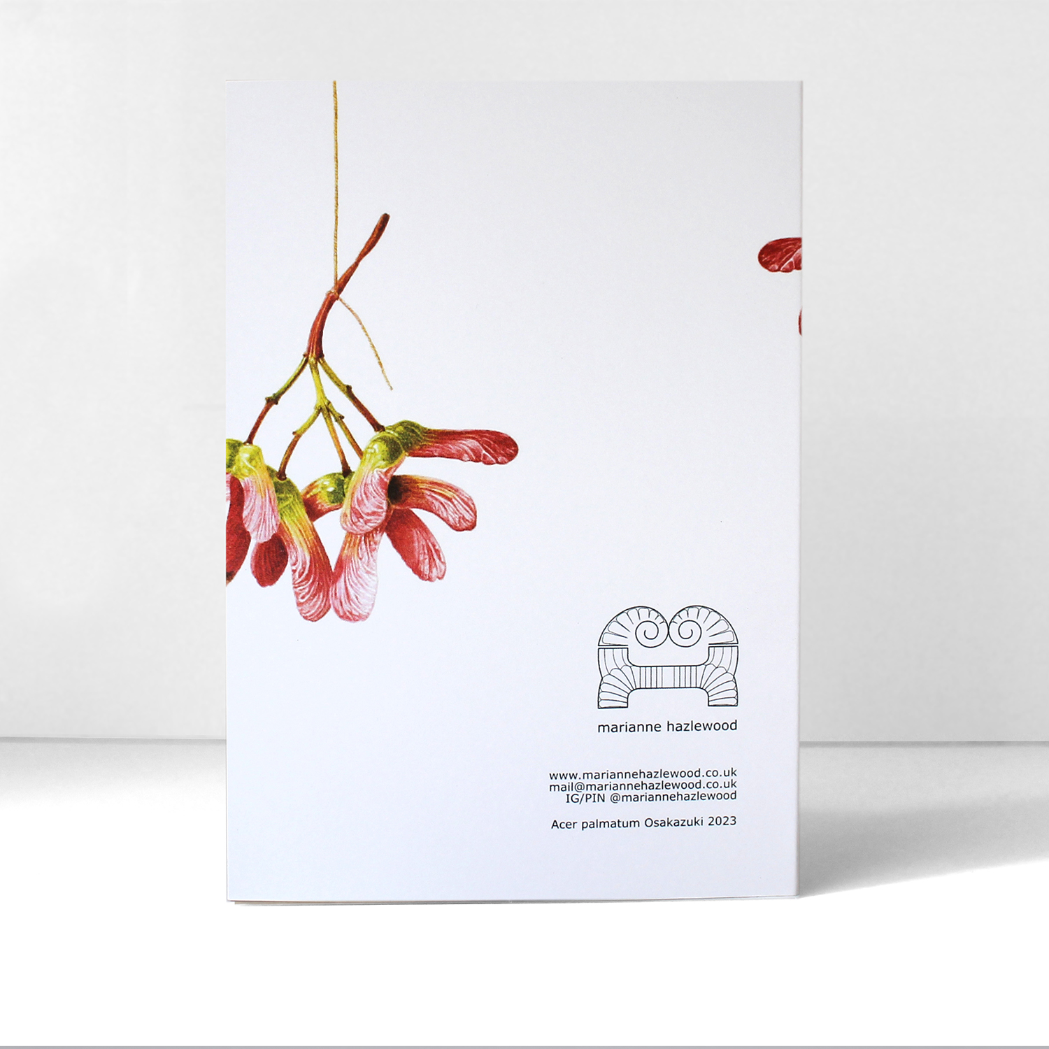 Hanging seeds & fruits – Acer palmatum Osakazuki – greetings card, 300gsm Matt artboard, Fits a C6 envelope, Blank white interior, Packaged with a Black envelope, with an address label, in a clear sleeve.