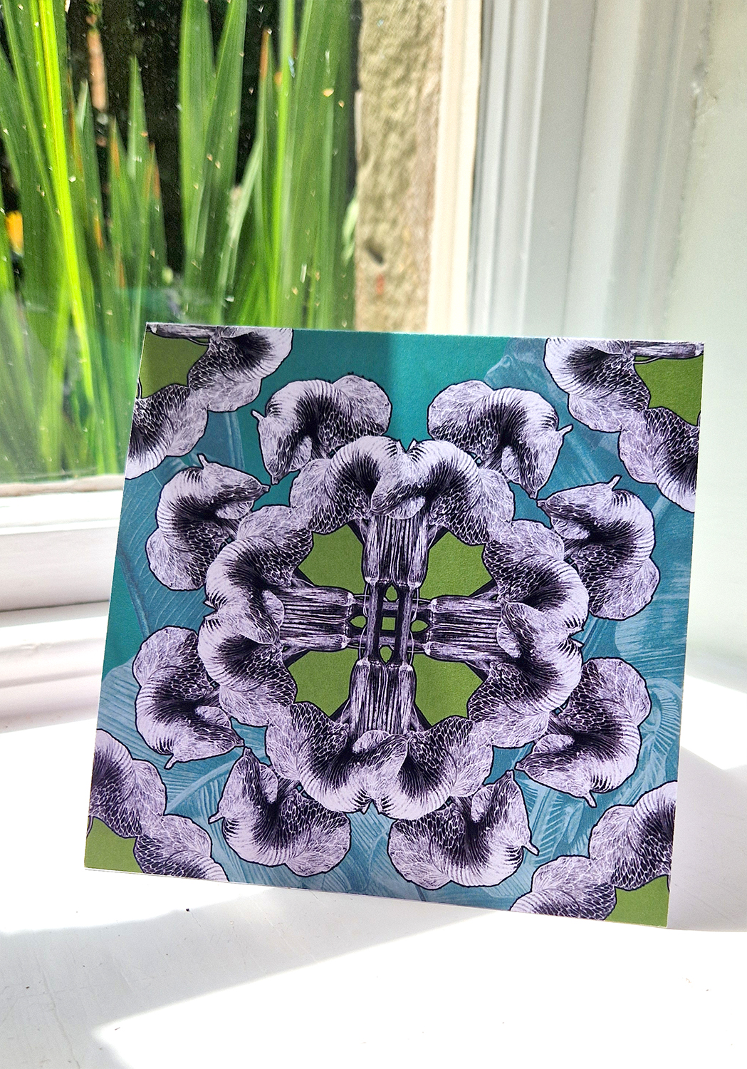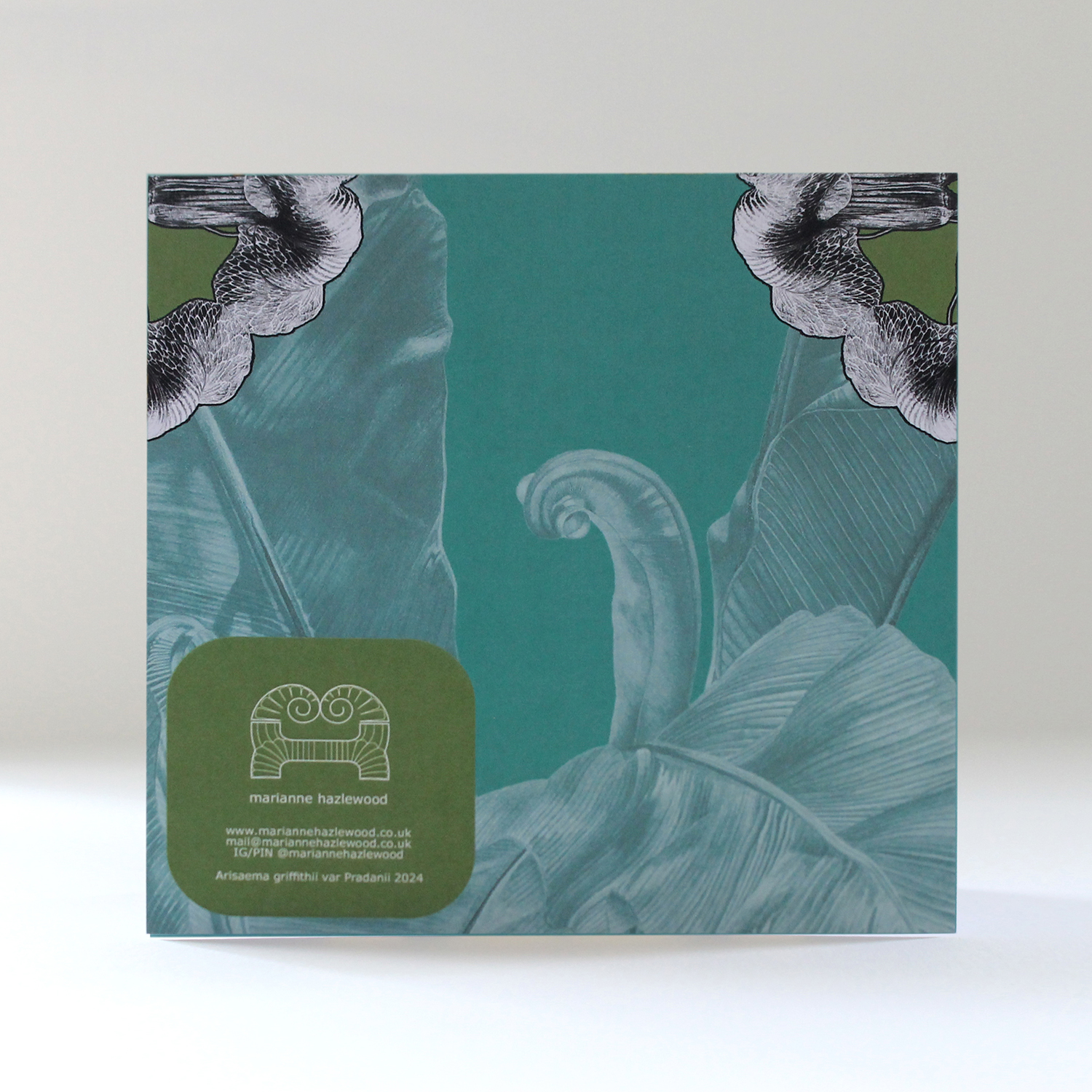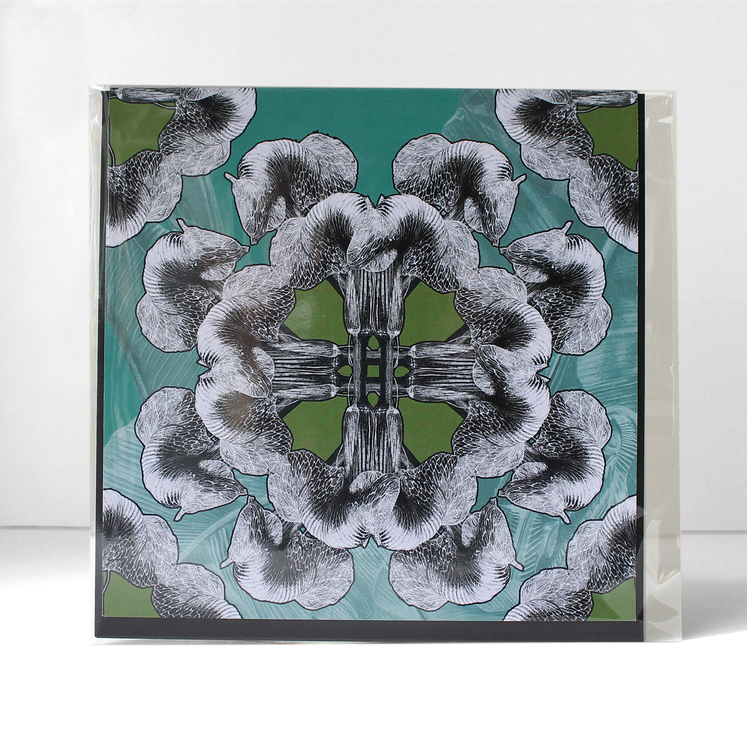 Square greetings card – Regency Green Mandala Arisaema Griffithii var Pradhanii 300gsm Matt artboard Fits into Square envelope Blank white interior Packaged with a Black envelope, in a clear sleeve.