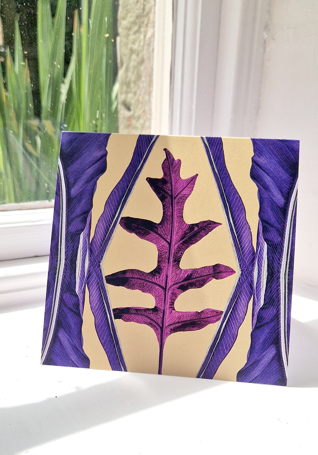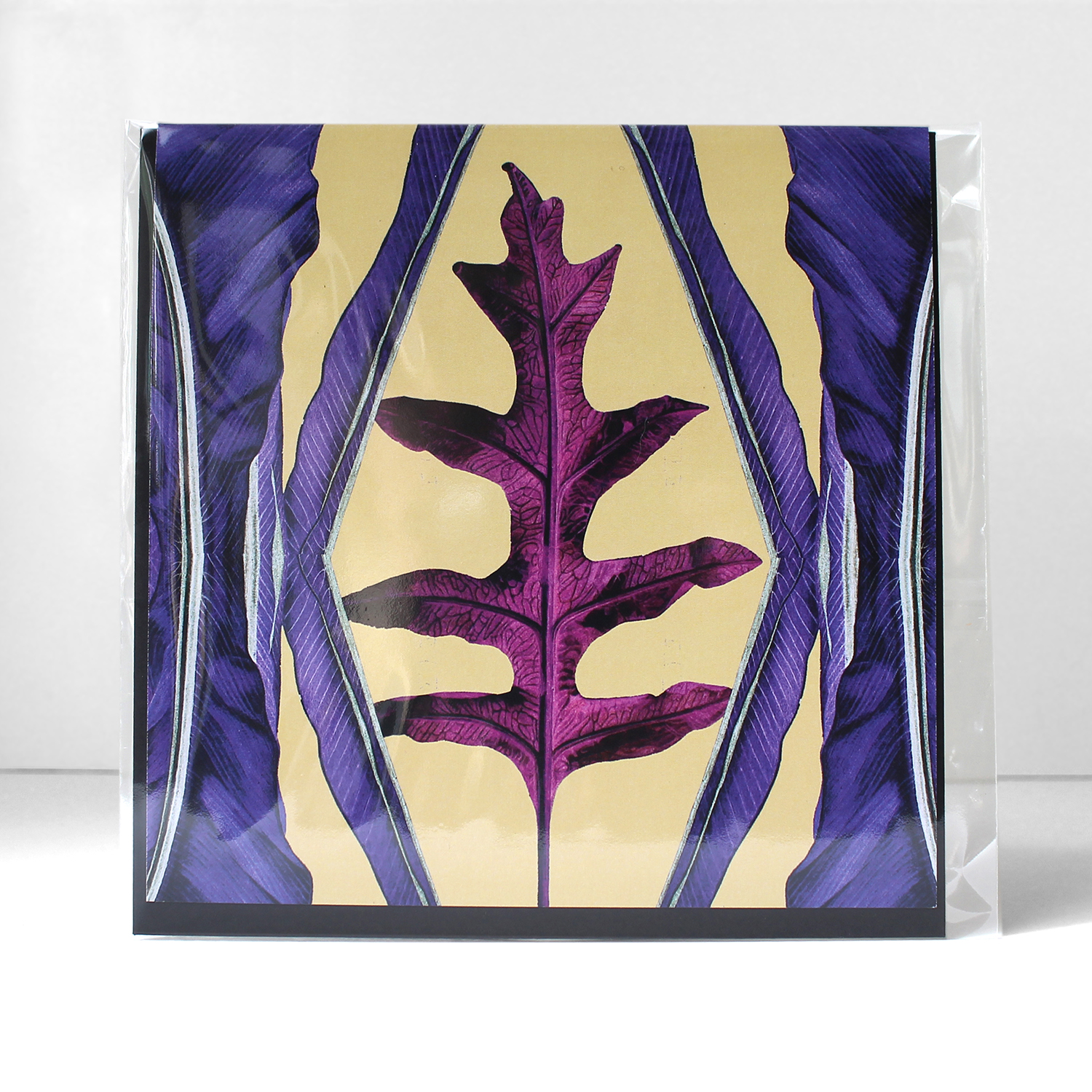 Square greetings card – Regency Purple Asplenium & Phlebodium, 300gsm Matt artboard, Fits into Square envelope, Blank white interior, Packaged with a Black envelope, in a clear sleeve.